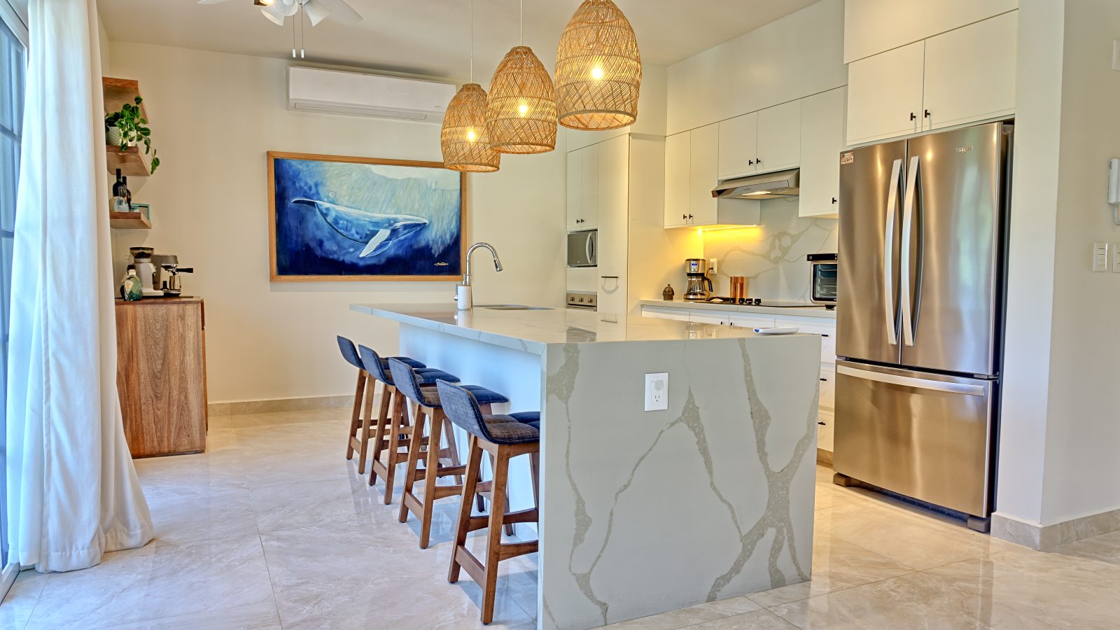 The gourmet kitchen serves as the heart of the condo, equipped with high-end appliances, plentiful storage, and a large island with bar seating—ideal for cooking, casual dining, or entertaining guests. Expansive floor-to-ceiling sliding glass doors allow abundant natural light to flow through the living areas, while seamlessly connecting to your private balcony, where you can enjoy the calming sea breeze and panoramic views.